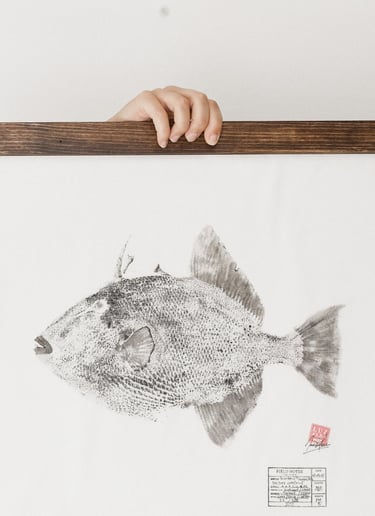 Inspired by the Japanese Gyotaku technique, LUZALBA developed her own practice by adapting its fundamental elements. These adjustments led her to a stronger concept: sustainability. At this point, art become a vehicle for exploration, as an opportunity to understand more about the ocean, marine life, the fishing industry, and conscious food consumption.